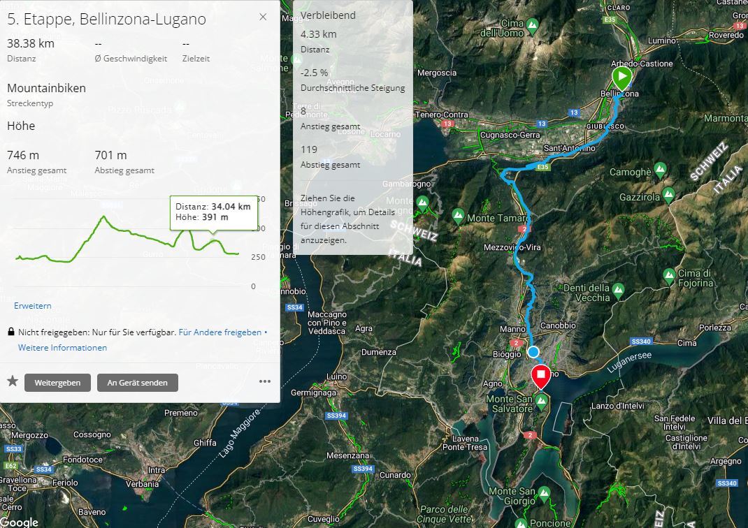 Die letzte längere Route dieser Tour. Beginnt in der Magadino Ebene und dann die Hauptstrasse rauf über den Monte Ceneri. Nicht unbedingt ein Vergnügen, starker Verkehr, erst nach dem Ceneri gibt es wieder Nebenstrassen oder Radwege bis nach Lugano. Den restlichen Tag genossen wir mit Chillen.